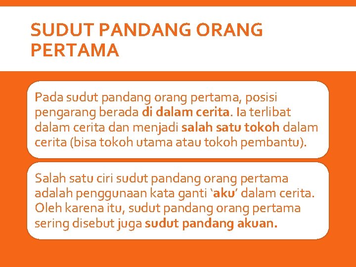 Sudut pandang orang pertama, sudut pandang ini biasanya menggunakan kata ganti aku atau saya.