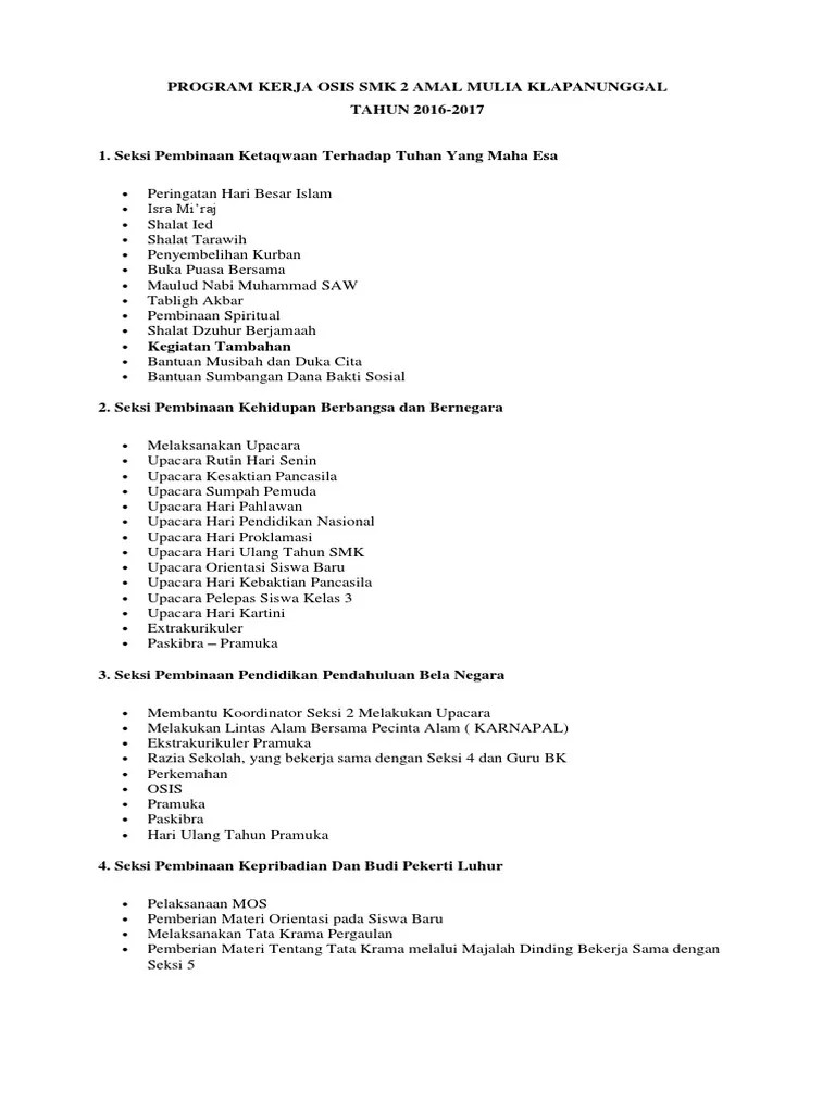 Cara membuat program kerja dengan baik dan benar akan saya jabarkan dalam video kali ini, seperti apakah caranya akan saya usahakan . Organisasi siswa intra sekolah, disingkat osis. Sasaran umum terwujudnya koordinasi yang matang antar seksi bidang, . Contoh program osis di masa pandemi · mengadakan program lomba karya ilmiah · mengadakan lomba menyanyikan lagu nasional · membuat jadwal piket . Apa kabar para pembaca penuliscilik.com, kali ini aku ingin memberikan informasi tentang contoh program . Meningkatkan keimanan dan ketakwaan terhadap tuhan yang maha esa; Organisasi siswa intra sekolah (osis) yang merupakan . Kegiatan ekstrakulikuler dapat dijadikan wadah untuk menampung berbagai aktifitas dan kreatifitas siswa. Seksi pembinaan ketaqwaan terhadap tuhan yang maha esa. Meningkatkan skill anggota dalam organisasi untuk memupuk kedisiplinan dan . Contoh program kerja pengurus osis (organisasi siswa intra sekolah) · 1) koordinasi dansos (dana sosial). Program kerja pengurus harian osis a. · 2) mengelola sisa keuangan dari setiap kegiatan.